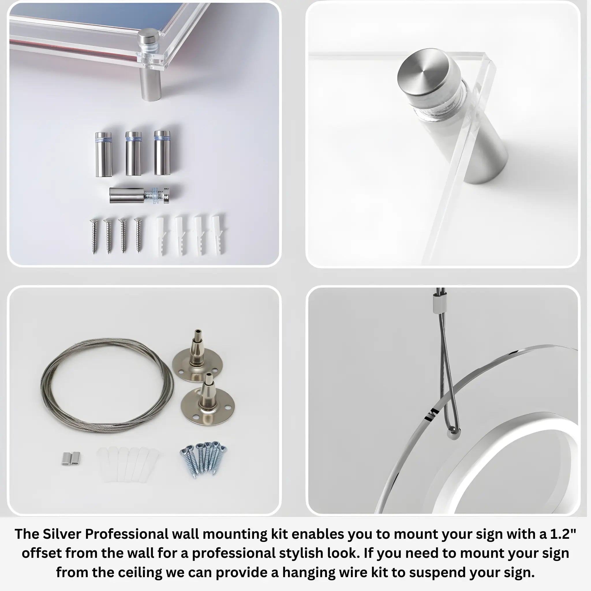 - Your choice between our metal spacer mounting kit for aesthetically securing your sign to any wall or our ceiling mounting kit for hanging displays.